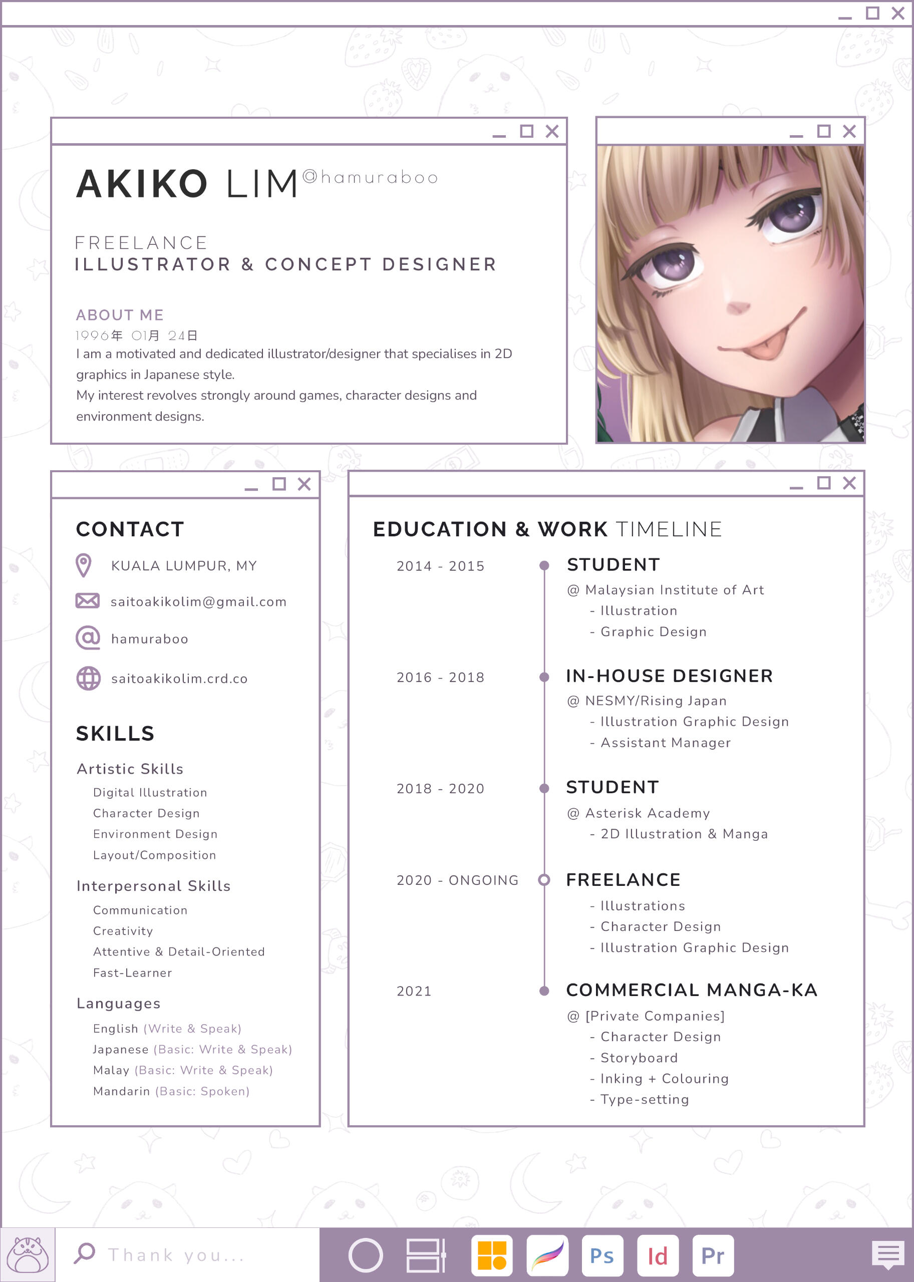 I am a motivated and dedicated illustrator/designer that specialises in 2D graphics in Japanese style.My interest revolves strongly around games, character designs and environment designs.